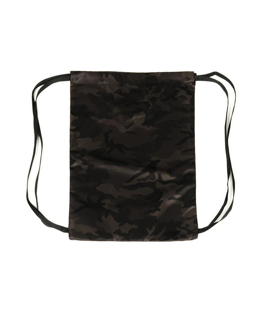Camo drawstring bag with velcro brand patch. Features a velcro brand patch with black 'AARMY' embroidery on the front for an optional custom velcro patch.