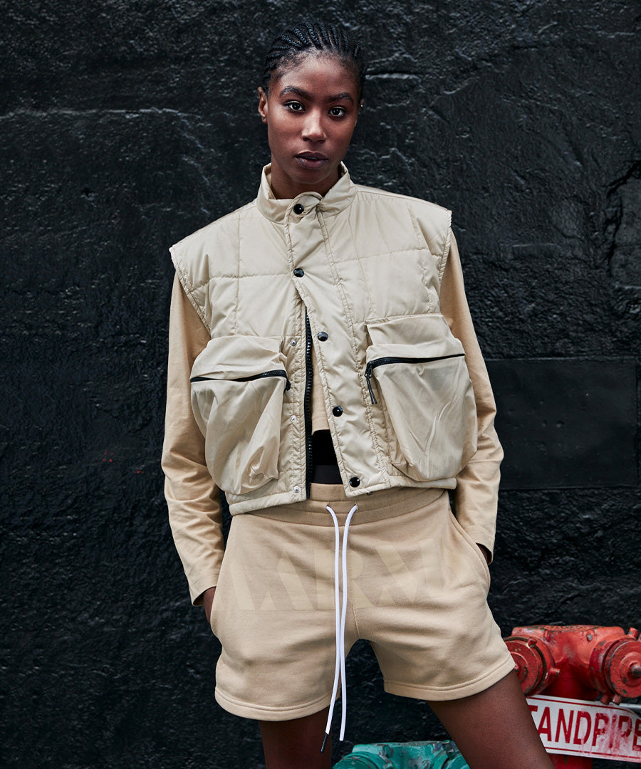 The Puffer jacket is a reversible, versatile quilted down vest. Water-resistant nylon with a brushed finish for softness and interior/exterior quilting. Featuring utility details like large zipper pockets. Pair with the point guard short for complete comfort post practice.